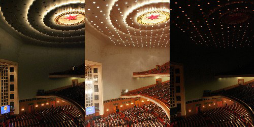 人民大会堂活动场所空间大,举行大型活动时,工作人员根据现场客人入场情况按阶梯式开启照明灯,待客人大批入场时再打开全部照明灯,此举可以节约大量照明用电。这组拼版照片显示的是3月10日,十一届全国人大一次会议第三次全体会议时人民大会堂内的照明情况。左图:会前,出席人员正在入场,照明灯部分开启。中图:会中,照明灯全部开启。右图:会后,出席人员离场,照明灯逐渐关闭,仅为整理会场的工作人员保留基本照明。新华社记者尹栋逊摄