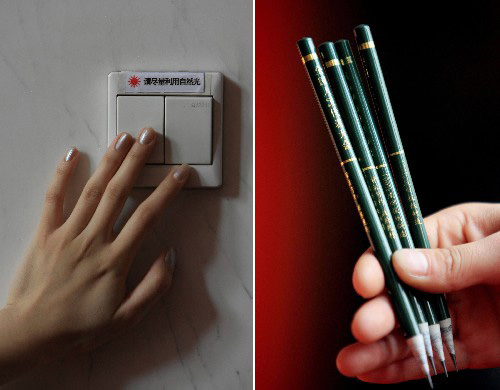 (资料图)左图:人民大会堂内一处照明灯开关旁贴着“请尽量利用自然光”的提示(3月10日摄)。类似的提示随处可见。右图:人民大会堂供会议使用的、以废旧报纸为原料制造的铅笔(3月10日摄)。 新华社记者尹栋逊摄