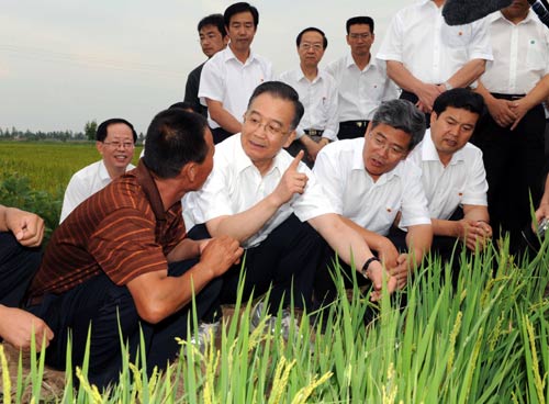 在宁夏回族自治区成立50周年大庆前夕,中共中央政治局常委、国务院总理温家宝到宁夏深入工厂企业、田间地头,走访居民,亲切慰问各族干部群众,共商宁夏未来发展大计。这是8月15日,温家宝在贺兰县洪广镇优质粮产销合作社了解水稻种植情况。(新华社记者饶爱民摄)