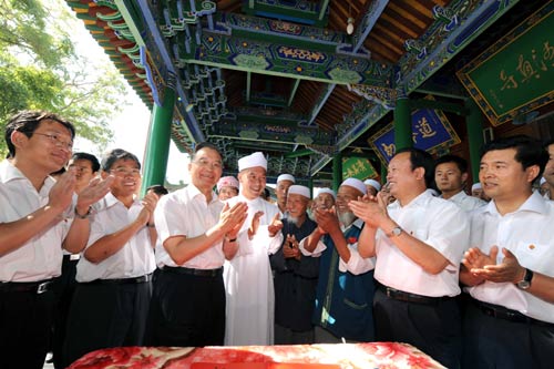 这是8月17日,温家宝来到具有悠久历史的银川纳家户清真寺,看望宗教人士和回族群众。(新华社记者饶爱民摄)