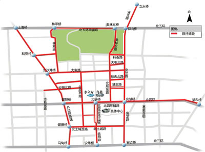 限行路段:奥林东路由奥林东桥(含)向南,经奥林东路至奥林东路南口(含)双向。