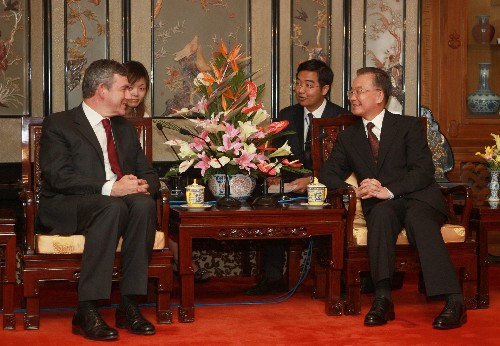温家宝说,在新形势下中英共享发展机遇、携手应对挑战,符合两国和两国人民的根本利益,也有利于世界和平与发展。双方应从战略高度和长远角度出发,坚持相互尊重和平等互利原则,切实维护两国关系大局。中方愿与英方保持高层交往,加强战略对话,妥善处理分歧,推动各领域友好交流与互利合作取得更大进展。
