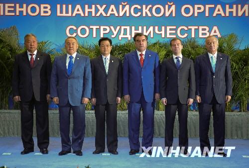 8月28日,国家主席胡锦涛在塔吉克斯坦杜尚别出席上海合作组织峰会时同各成员国元首合影。 新华社记者李学仁摄