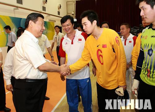 这是习近平在北京理工大学体育馆看望正在训练的盲人门球运动员。新华社记者庞兴雷摄