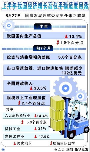 新华社北京8月29日电(记者陈二厚、任芳、黄少达)面对上半年国际物价飞涨与国内食品结构性短缺、出口下滑、自然灾害多发的严峻形势,中国经济迎难而上,以10.4%的增速和7.9%的通胀率实现了平稳较快发展,在世界经济体中发挥了“稳定器”的作用。最近,国际大宗商品价格显著回落,通胀压力有所缓解。专家认为,国际环境减压,中国经济保持平稳较快发展的空间增大。