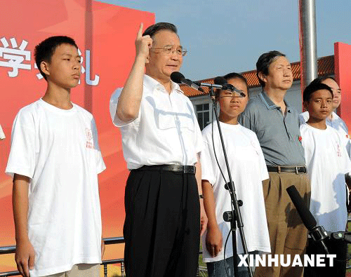 9月1日,正在四川地震灾区考察的中共中央政治局常委、国务院总理温家宝来到设在四川长虹集团培训中心的北川中学临时学校,参加正在这里举行的秋季开学典礼。新华社记者 黄敬文 摄