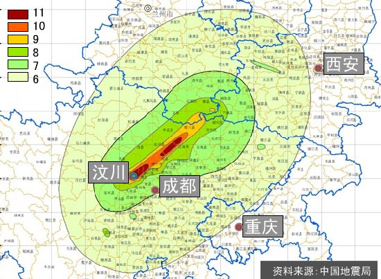 汶川8.0级地震发生后,中国地震局组织专家赴四川、甘肃、陕西、重庆、云南、宁夏等省(自治区、直辖市)开展了现场调查,调查面积达50万平方公里,调查点4150个,在实地调查基础上,编绘了汶川8.0级地震烈度分布图。