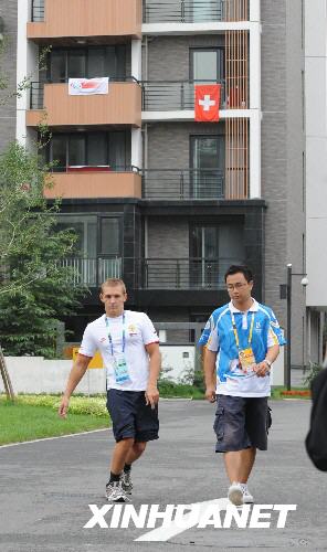 8月30日,运动员(左)在残奥村内散步。当日,北京残奥村正式开村。 新华社记者李文摄