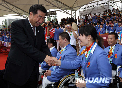 8月30日,北京残奥会中国体育代表团在残奥村升旗广场隆重举行誓师动员大会。中共中央政治局委员、国务院副总理、国务院残疾人工作委员会主任回良玉出席会议并向中国体育代表团授旗。这是回良玉和运动员握手。 新华社记者姚大伟摄