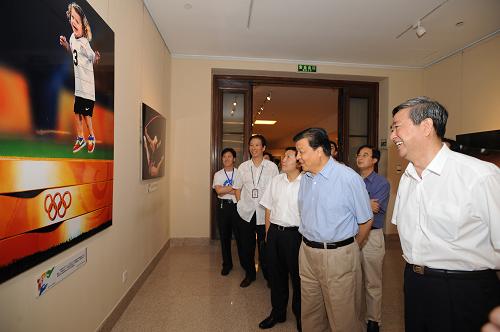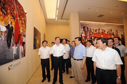 9月5日,中共中央政治局委员、书记处书记、中宣部部长刘云山来到中国美术馆,参观“分享光荣与梦想——2008北京奥运会大型新闻图片展”,称赞这次图片展的水平堪称一流。新华社社长李从军、副社长鲁炜,中国美术馆馆长范迪安陪同参观。新华社记者高洁摄
