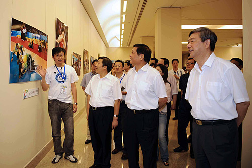 9月9日,中共中央政治局委员、北京市委书记、北京奥组委主席刘淇(前右二)来到中国美术馆,参观“分享光荣与梦想——2008北京奥运会大型新闻图片展”。新华社社长李从军、副社长鲁炜陪同参观。 新华社记者王建华摄