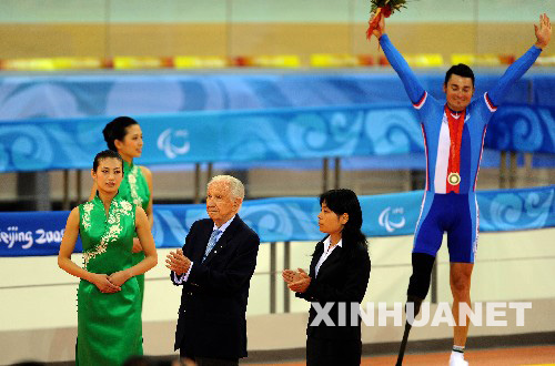 9月9日,国际奥委会名誉主席萨马兰奇(右三)在颁奖仪式上鼓掌。当日,萨马兰奇出席北京2008年残奥会场地自行车男子1公里计时赛(LC2)颁奖典礼并为前三名运动员颁奖。 新华社记者王雷摄