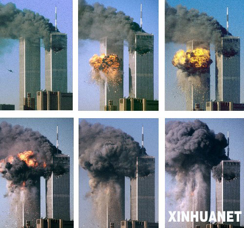 2001年9月11日,恐怖分子劫持了美国4架民航客机,其中两架撞坍了纽约世贸中心“双子大厦”,一架撞毁华盛顿五角大楼的一角,另一架坠毁。这一系列袭击导致3000多人死亡,并造成数千亿美元的直接和间接经济损失。 这是一架飞机撞击纽约世贸中心“双子大厦”南楼的拼版照片(2001年9月11日摄)。 新华社发