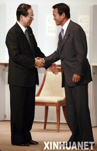 9月22日,在日本东京,福田康夫(左)祝贺麻生太郎当选自民党新任总裁。当日下午,日本自民党干事长麻生太郎在自民党国会两院议员总会上当选为自民党新一任总裁。新华社记者任正来摄