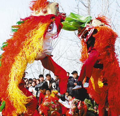 2007年12月23日,河南省内黄县城关镇丁庄村内,该县组织的文化下乡舞狮小分队正在为群众表演。张晓霞 陈胜利 摄影报道