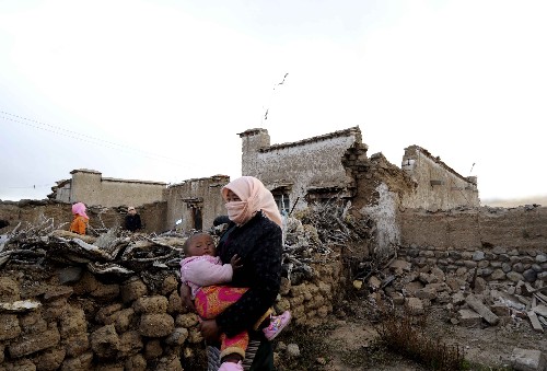 10月6日,西藏当雄县的一名牧民带着孩子从倒塌的房屋旁走过。 西藏当雄县6.6级地震震区格达乡有人员死亡,上百间房屋倒塌。格达乡交通、通讯中断,西藏自治区政府已协调解放军部队前往救援,并紧急派出医疗队赶赴现场。拉萨市当雄县发生地震后,西藏自治区党委、政府高度重视,立即成立了应急指挥部,并于第一时间启动自治区2级应急响应。 新华社记者普布扎西摄