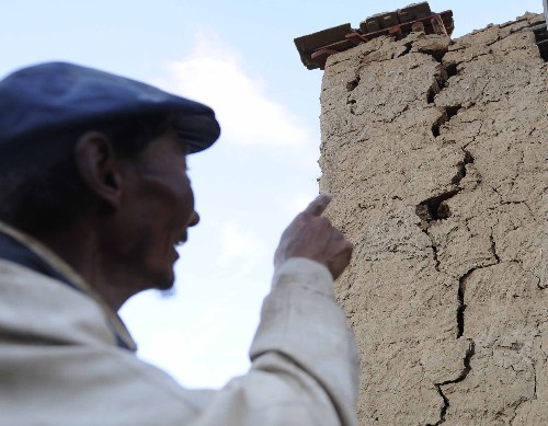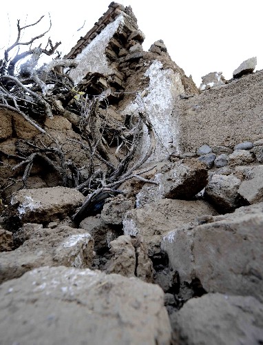 10月6日,当雄县格达乡一位农民在查看受损的房屋。新华社记者普布扎西摄