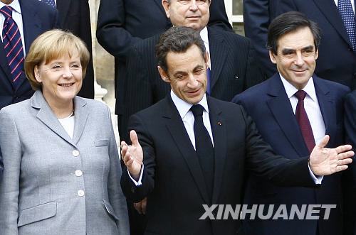 10月12日,法国总统萨科齐(中)、总理菲永(右)与德国总理默克尔(左)等欧元区首脑在峰会前合影。 当天,欧元区15国首脑在巴黎召开有史以来的首次峰会,寻求为共同应对当前愈演愈烈的金融危机而采取联合行动。新华社记者张玉薇摄