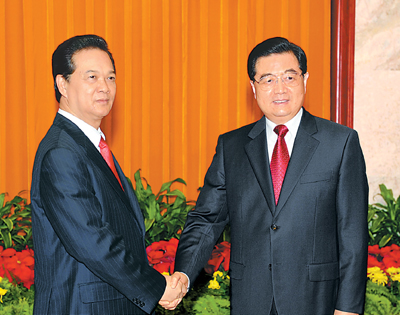 10月22日,国家主席胡锦涛在北京人民大会堂会见来华进行正式访问并出席第七届亚欧首脑会议的越南总理阮晋勇。