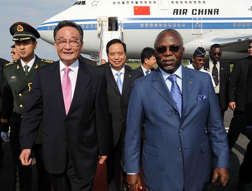 11月6日,全国人大常委会委员长吴邦国抵达加蓬首都利伯维尔,开始对加蓬进行正式友好访问,加蓬国民议会议长恩达马到机场迎接。新华社记者高洁摄