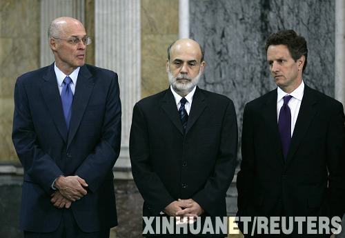 盖特纳(右)、伯南克(中)和现任财长保尔森(左)出席财政部新闻发布会的资料照片 新华社/路透 图