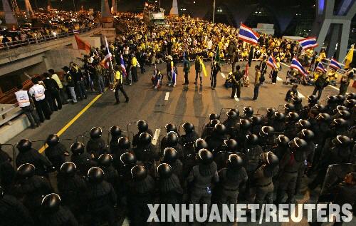 11月25日,泰国警察与反政府的人民民主联盟(民盟)示威者在曼谷素万那普国际机场的主路上对峙。由于民盟举行的大规模抗议活动危及机场安全,泰国机场管理局25日晚间下令关闭首都曼谷素万那普国际机场。 新华社/路透