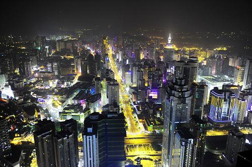 10月11日,华灯初上,高楼林立的深圳市中心车水马龙,流光溢彩。作为中国改革开放的总设计师邓小平亲自倡导设立的中国第一个经济特区,深圳一直被看作是中国改革开放的窗口。从1980年国家批准设立经济特区以来,“深圳速度”已经成为人们的一个习惯用语。在短暂的28年间,深圳从一个人口只有3万人的边陲小渔村发展到人口过千万的现代大都市,城区面积也从最初的3平方公里扩大到了700多平方公里,GDP也从1979年的1.79亿元增长到了2007年的6700多亿元,创造了世界经济发展史上的奇迹。深圳目前已经成长为中国内地经济最发达的城市之一。高新技术产业、现代物流业、金融服务业以及文化产业是其四大支柱产业。此外,作为中国主要的外贸口岸,深圳进出口总额连续10多年位居大中城市第一。2007年,深圳人均GDP达到10628美元,成为内地首个人均GDP过万美元的城市。新华社记者 任勇 摄