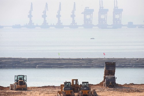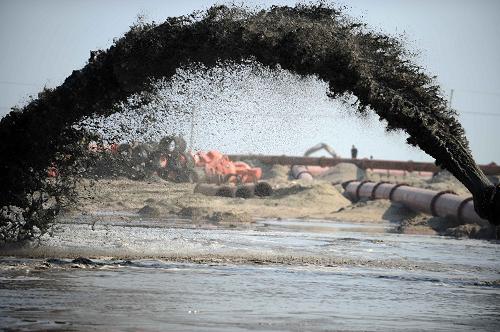 11月13日,钦州保税港区“吹沙填海”工程正在加紧进行。目前钦州保税港区各项建设正强力推进,预计一期工程将于2009年12月底完成封关运作。5月29日国务院批准设立的广西钦州保税港区是中国第六个、西部地区第一个保税港区,建成后将主要发展国际中转、国际采购、国际配送、国际转口贸易和出口加工等业务。新华社记者 周华摄