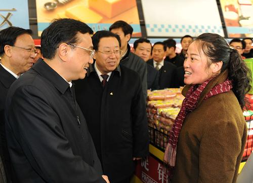 这是1月17日,李克强在甘肃兰州市雁滩商贸市场察看节日市场供应时和顾客交谈。新华社记者李学仁摄