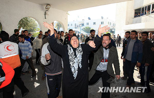 1月15日,一名巴勒斯坦妇女在加沙城的希法医院外哭泣。新华社记者纳赛尔摄