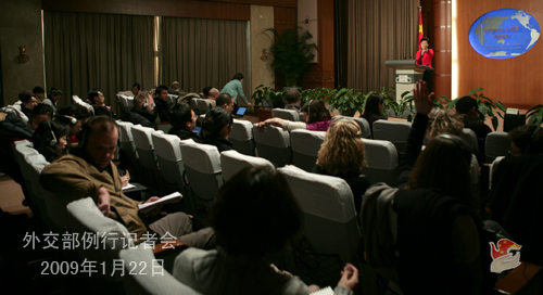 2009年1月22日,外交部发言人姜瑜举行例行记者会,主要就中美、中法关系,中东局势等答记者问。