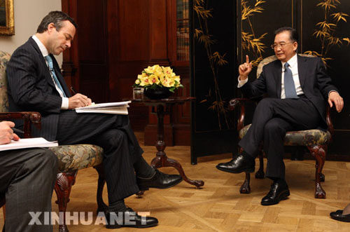 2月1日,中国国务院总理温家宝在英国伦敦接受《金融时报》主编巴伯的专访。新华社记者姚大伟摄