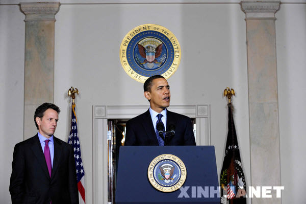 2月4日,美国总统奥巴马(右)与财政部长盖特纳在白宫就美国公司高管薪酬问题发表讲话。奥巴马当日宣布,接受联邦政府大笔金融救助款的企业高级管理人员年薪不得超过50万美元。新华社记者张岩摄