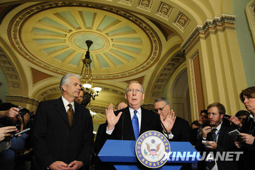 2月10日,美国国会参议院少数党领袖麦康奈尔(中)在国会山出席记者会。当日,美国国会参议院在最终投票中以61票对37票的投票结果,批准了总额为8380亿美元的经济刺激计划。新华社记者张岩摄