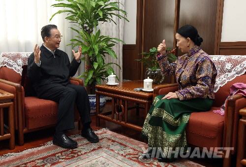 2月14日,国务院总理温家宝邀请著名傣族舞蹈表演艺术家刀美兰到中南海总理办公室做客,与她一起探讨如何更好地传承和发扬光大少数民族文化艺术。(新华社记者姚大伟摄)
