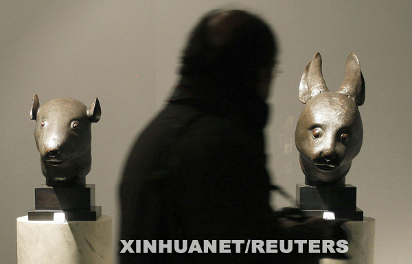 这是2月21日拍摄的在巴黎大皇宫预展中的鼠首和兔首铜像。新华社/路透