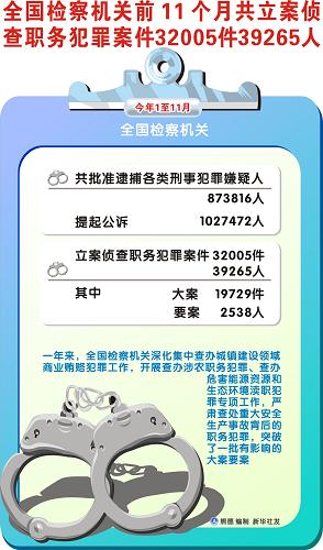图表:全国检察机关前11个月共立案侦查职务犯罪案件32005件39265人 新华社发