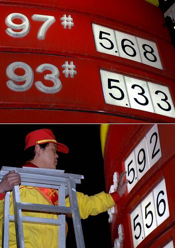 国家发展改革委24日宣布,鉴于近期国际市场原油价格持续上升,根据完善后的成品油价格形成机制,决定自3月25日零时起将汽、柴油价格每吨分别提高290元和180元。调整后97号汽油每升为5.92元,上涨0.24元;93号汽油每升5.56元,上涨0.23元。这是调整前的97号、93号汽油价格(上)和调整后的价格(下)。新华社记者公磊摄