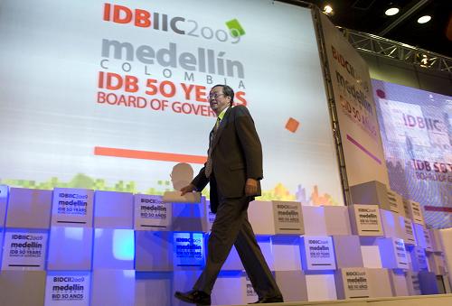 3月28日,在哥伦比亚第二大城市麦德林举行的美洲开发银行高峰论坛上,中国人民银行行长周小川走上发言台。当天,周小川在美洲开发银行高峰论坛上发表主题讲话时说,中国加入美洲开发银行将进一步扩大中国和拉美的双边合作关系,双方不断深化的友好合作将增强中国和拉美国家共同抵御金融危机的能力。新华社发(戴维·德拉巴斯摄)