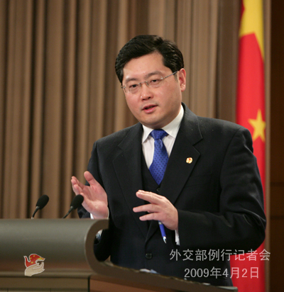 2009年4月2日下午,外交部发言人秦刚主持例行记者会,就朝鲜半岛局势、二十国集团伦敦金融峰会、中美领导人会晤、中法关系等回答记者提问。