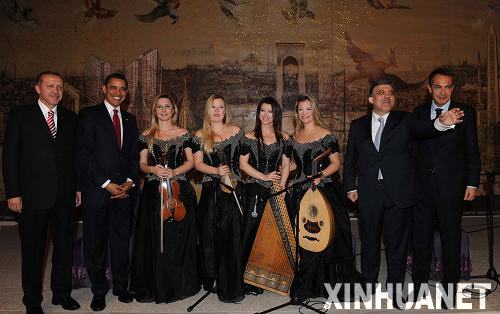 4月6日,在土耳其伊斯坦布尔,美国总统奥巴马(左二)、土耳其总理埃尔多安(左一)、土耳其总统居尔(右二)和西班牙首相萨帕特罗(右一)与土耳其演员合影。奥巴马5日晚抵达安卡拉,开始对土耳其进行为期两天的正式访问。新华社/阿纳多卢通讯社