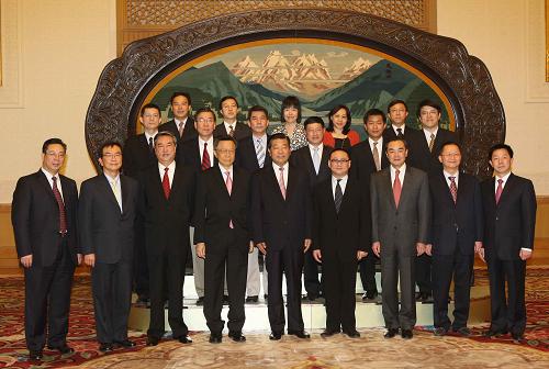 4月9日,中共中央政治局常委、全国政协主席贾庆林在北京人民大会堂会见王文杉率领的台湾联合报系访问团一行。新华社记者 刘卫兵 摄