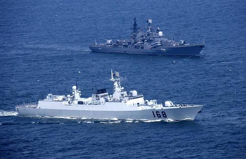 2005年8月23日,中俄海军导弹驱逐舰在实施海上协同。参加“和平使命-2005”中俄联合军事演习的双方海空军部队,经过数天高强度实兵对抗,23日在山东半岛东南海域进行海上封锁作战演练。