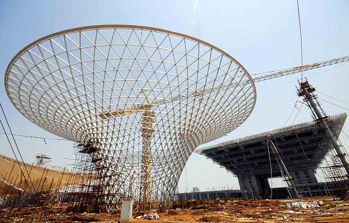 世博轴4号“阳光谷”率先亮相,与中国馆遥相呼应(4月25日摄)。由6个巨型圆锥状钢结构组成的世博轴“阳光谷”,将于今年上半年全部亮相。“阳光谷”采用钢结构,让自然光倾泻而下,满足部分地下空间的采光,体现环保、节约办世博的理念。新华社发