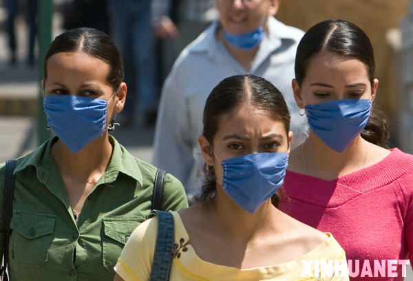 4月26日,几名墨西哥城市民戴着口罩走在市中心的路上。当日,墨西哥城市长马赛洛·埃布拉德宣布,该市在最近24小时内有5名猪流感疑似患者死亡,致使首都的猪流感疑似患者死亡总人数升至15人。墨西哥城市政府临时决定追加发放100万只免费口罩。新华社发(戴维摄)