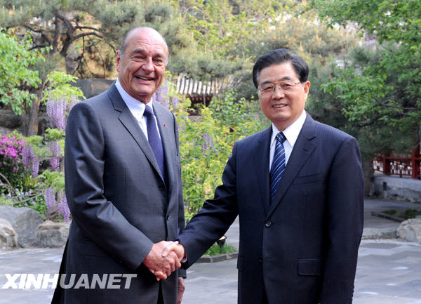 4月28日,国家主席胡锦涛在北京钓鱼台国宾馆会见法国前总统希拉克。新华社记者李学仁摄