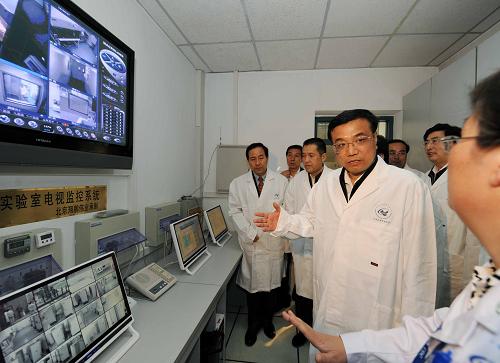 4月29日,中共中央政治局常委、国务院副总理李克强在北京首都国际机场、中国疾病预防控制中心考察人感染猪流感防控工作。这是李克强考察中国疾病预防控制中心实验室。新华社记者饶爱民摄