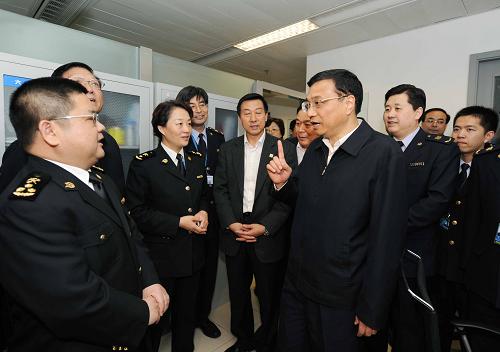 4月29日,中共中央政治局常委、国务院副总理李克强在北京首都国际机场、中国疾病预防控制中心考察人感染猪流感防控工作。这是李克强在首都国际机场3号航站楼与海关人员交谈。新华社记者饶爱民摄