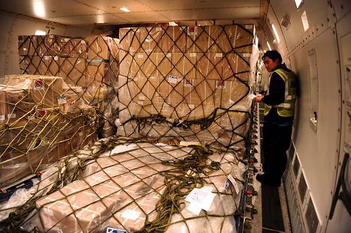 5月4日,救援物资在机舱中码放得井井有条。当日凌晨3时50分许,中国向墨西哥提供的第二批人道主义紧急救援物资从北京首都国际机场启运。第二批救援物资包括口罩、手套、隔离服、消毒用品和红外测温计等,共六千余箱,总重53.6吨,由中国南方航空公司承运。新华社发(马儒壮 摄)