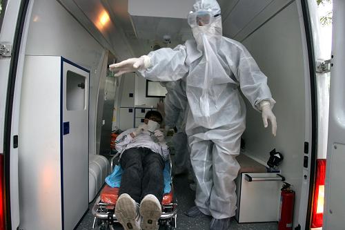 5月13日,山西省运城市举行防控甲型H1N1流感应急演练,通过发热门诊对“疑似患者”接诊、专家会诊、流行病学调查、救治处理、消毒以及应急隔离等环节处置,以提高运城市各部门对突发公共卫生事件的应急处置效率和医疗卫生人员的实战能力。新华社发(薛俊 摄)